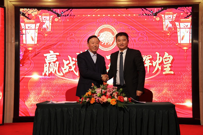于寶權(quán)董事長分別與遼陽公司總經(jīng)理孫繼莊、天華公司總經(jīng)理宋偉、天泰公司總經(jīng)理于洪濤、盤錦公司總經(jīng)理周春雷、物業(yè)公司總經(jīng)理王化啟、萬豪酒店總經(jīng)理馮國、商業(yè)公司總經(jīng)理陳雷簽訂2019年目標管理責任狀。