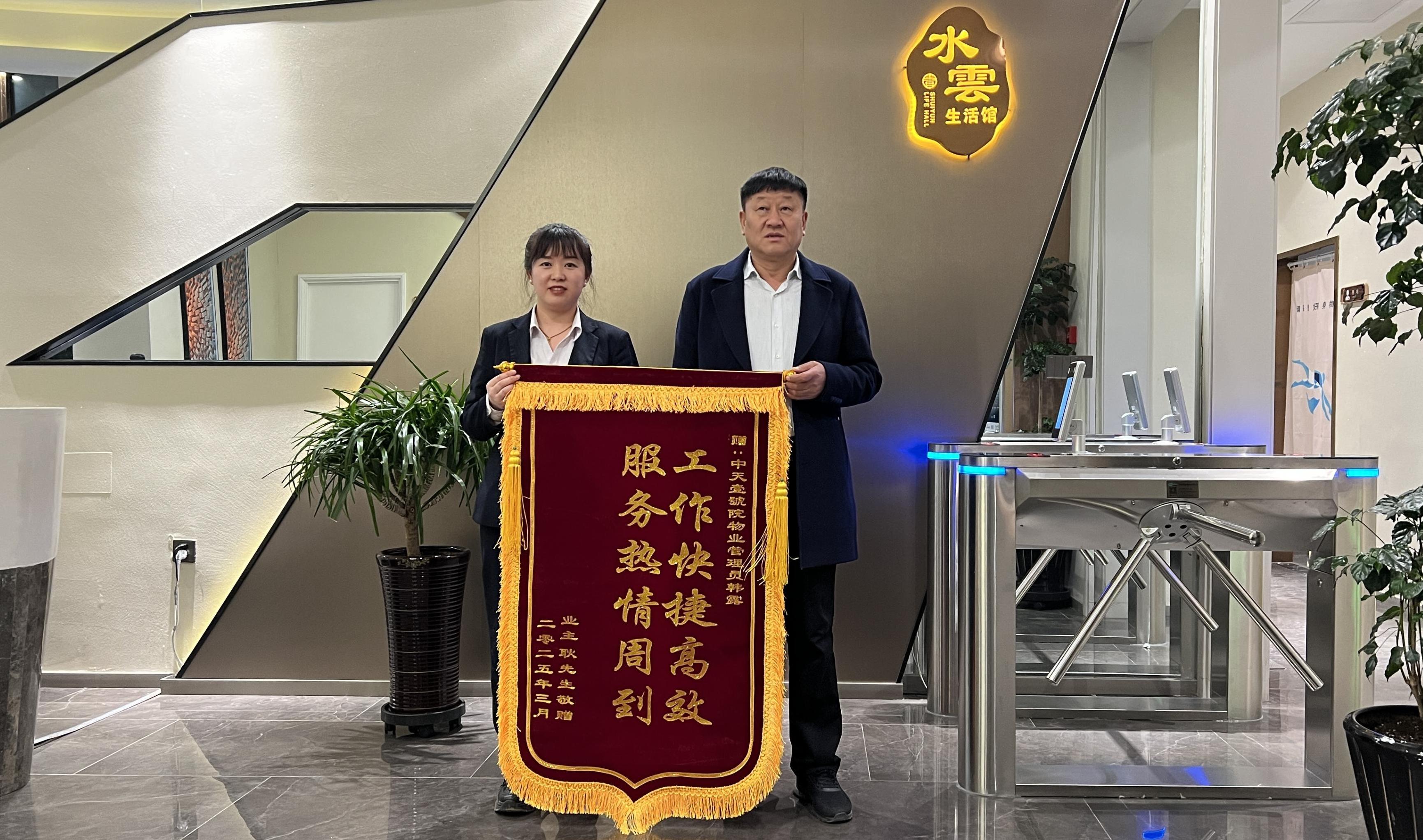 每一面錦旗背后,都有一個(gè)暖心的故事,都閃耀出一份真情和愛(ài)心。近日,中天壹號(hào)院水雲(yún)生活館的管理員就收到了一面充滿謝意的錦旗。就在上周,業(yè)主帶著外地來(lái)的朋友到會(huì)館休閑放松。朋友對(duì)會(huì)館的設(shè)施很感興趣,前臺(tái)的工作人員不僅耐心細(xì)致地為他們介紹了各個(gè)區(qū)域的功能,還根據(jù)他們的需求提供了游玩建議,讓朋友贊不絕口。在游玩過(guò)程中,業(yè)主朋友落下了自己的圍巾,前臺(tái)的工作人員發(fā)現(xiàn)后,第一時(shí)間聯(lián)系了業(yè)主,但業(yè)主表示今天沒(méi)有時(shí)間取回,可能要改天再來(lái)。我們的工作人員將圍巾收好并妥善保管直到業(yè)主取回。平日里,無(wú)論何時(shí)進(jìn)入會(huì)館,總能看到看到她面帶微笑,熱情地打招呼,辦理各項(xiàng)業(yè)務(wù)既高效又準(zhǔn)確。遇到業(yè)主咨詢問(wèn)題,也總是不厭其煩地解答,還會(huì)主動(dòng)提供幫助,讓每一位業(yè)主都感受到了家一般的溫暖。