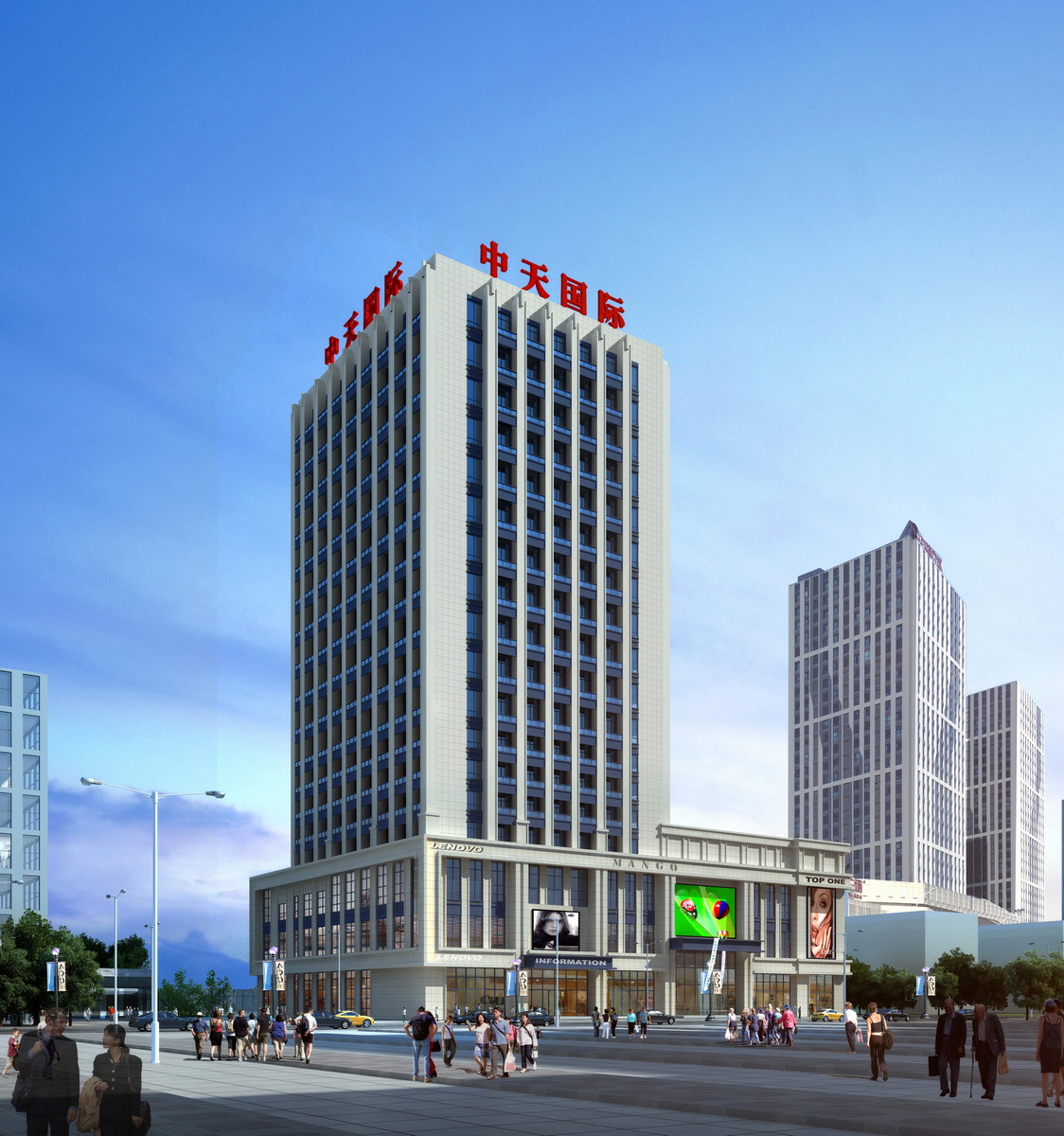 中天國際由中天集團投資,營口天達發(fā)展有限公司開發(fā)建設(shè),項目坐落于渤海大街南,小八路北與市府路西交匯處,是一座集商業(yè)、餐飲、高端酒店、奢華配套公寓等的商業(yè)一體化項目。