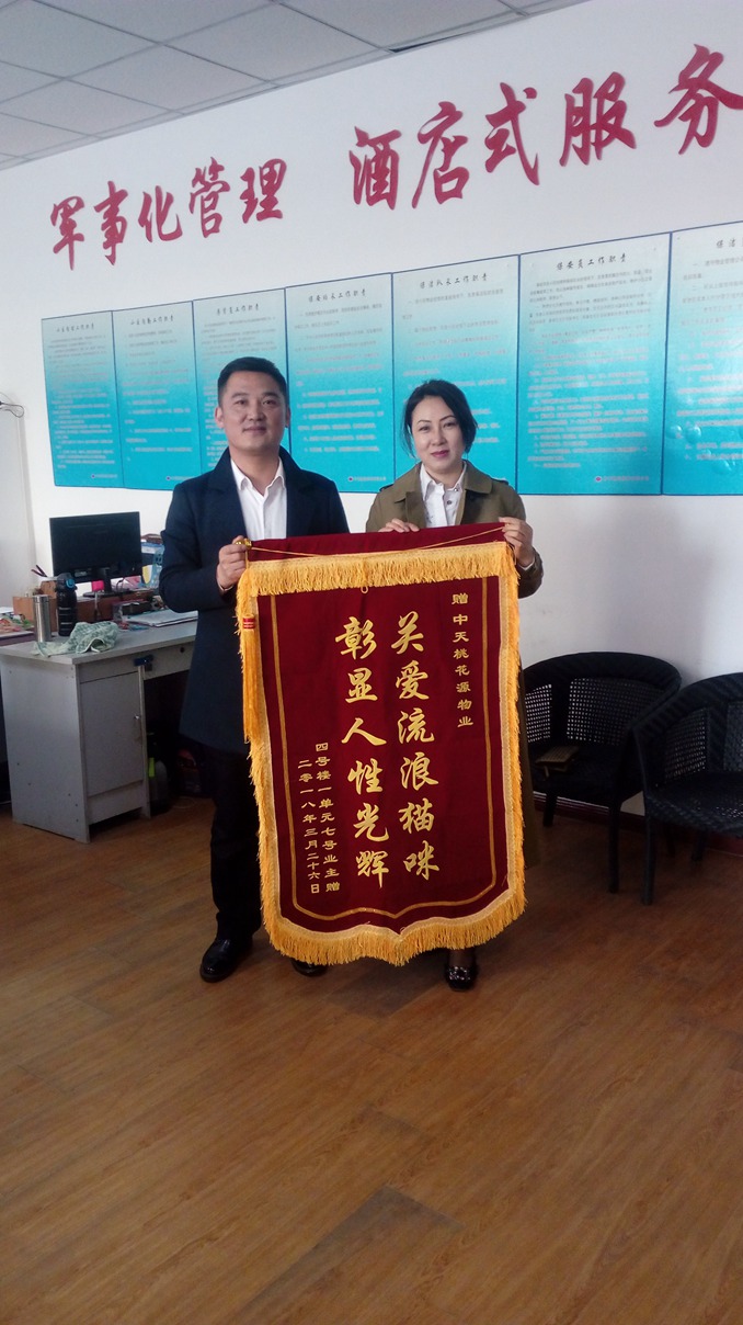 3月26日上午,桃花源小區(qū)4號(hào)樓業(yè)主送來(lái)一面錦旗,上面寫著“關(guān)愛流浪貓咪,彰顯人性光輝”。原來(lái)這位業(yè)主非常關(guān)愛小區(qū)流浪貓,她自費(fèi)購(gòu)買貓糧,在地下室角落每天投放。而我們的物業(yè)保潔不僅沒(méi)有驅(qū)逐流浪貓,還主動(dòng)幫助打掃喂食的地方,這份善意讓業(yè)主感動(dòng)。