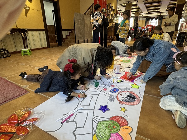 鋪開(kāi)長(zhǎng)長(zhǎng)的畫(huà)卷,一個(gè)個(gè)小畫(huà)家全身心投入盡情繪畫(huà)。迎風(fēng)飄揚(yáng)的國(guó)旗,是偉大祖國(guó)的標(biāo)志與象征;雄偉壯麗的天安門(mén),是對(duì)祖國(guó)偉大建筑物的崇拜;絢麗多彩的氣球與愛(ài)心,寄托著孩子們對(duì)祖國(guó)媽媽生日的祝福。孩子們用五彩斑斕的色彩繪制起波瀾壯闊的時(shí)代畫(huà)卷,一筆一畫(huà)深情地表達(dá)出對(duì)黨的感恩之情和對(duì)祖國(guó)的美好祝愿。家長(zhǎng)們也積極參與其中,用欣賞的眼光關(guān)注著孩子們的一涂一畫(huà),偶爾輕聲指導(dǎo),偶爾幫忙涂抹色彩。
