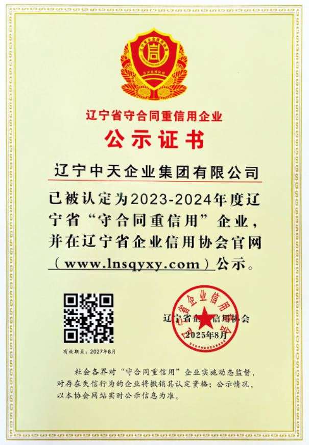 近日,中天集團憑借卓越的商業(yè)信譽和嚴(yán)謹(jǐn)?shù)穆募s能力,被遼寧省企業(yè)信用協(xié)會認(rèn)定為2023-2024年度遼寧省“守合同重信用”企業(yè)和信用等級5A級企業(yè),這是集團自2005年以來連續(xù)20年獲此殊榮。這一榮譽不僅是對集團長期以來堅持誠信經(jīng)營的高度認(rèn)可,更是對企業(yè)在打造品牌、服務(wù)社會方面不懈追求的充分肯定。