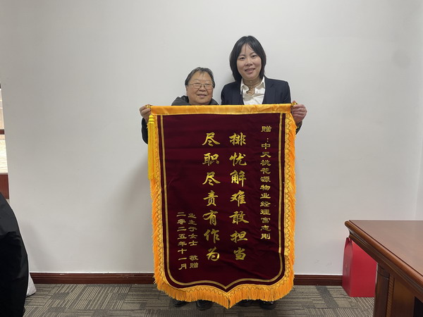 11月29日,中天桃花源小區(qū)15號樓3單元2-11樓業(yè)主捧著”排憂解難敢擔(dān)當(dāng),盡職盡責(zé)有作為”的錦旗來到物業(yè)辦公室,感謝中天桃花源物業(yè)經(jīng)理富志剛及物業(yè)全體員工給予高度的認(rèn)可。此前業(yè)主家突發(fā)水管破裂,物業(yè)經(jīng)理接到通知后,迅速聯(lián)系管家召集隊(duì)伍前往水管破裂現(xiàn)場,到達(dá)現(xiàn)場后仔細(xì)查看破裂口,物業(yè)經(jīng)理富志剛指揮有序,在與漏水口爭分奪秒,及時(shí)搶修,避免了損失擴(kuò)大,后續(xù)由保潔清理滿是水漬的地面,也保障了業(yè)主正常用水及進(jìn)出安全。業(yè)主家老人兒女經(jīng)常不在身邊,作為物業(yè)經(jīng)理總能為老人家排憂解難,遇到問題,都非常耐心的給老人家處理解決,無論是設(shè)施故障還是生活中的瑣事,物業(yè)經(jīng)理富志剛總能第一時(shí)間響應(yīng),以高效務(wù)實(shí)的態(tài)度全力解決。從每一個(gè)細(xì)節(jié)都彰顯著物業(yè)經(jīng)理的責(zé)任與擔(dān)當(dāng),同時(shí)也讓業(yè)主對中天桃花源物業(yè)全體員工的辛勤的付出和努力工作加以肯定,讓業(yè)主倍感安心與溫暖,因此用一面錦旗表達(dá)最誠摯的謝意。